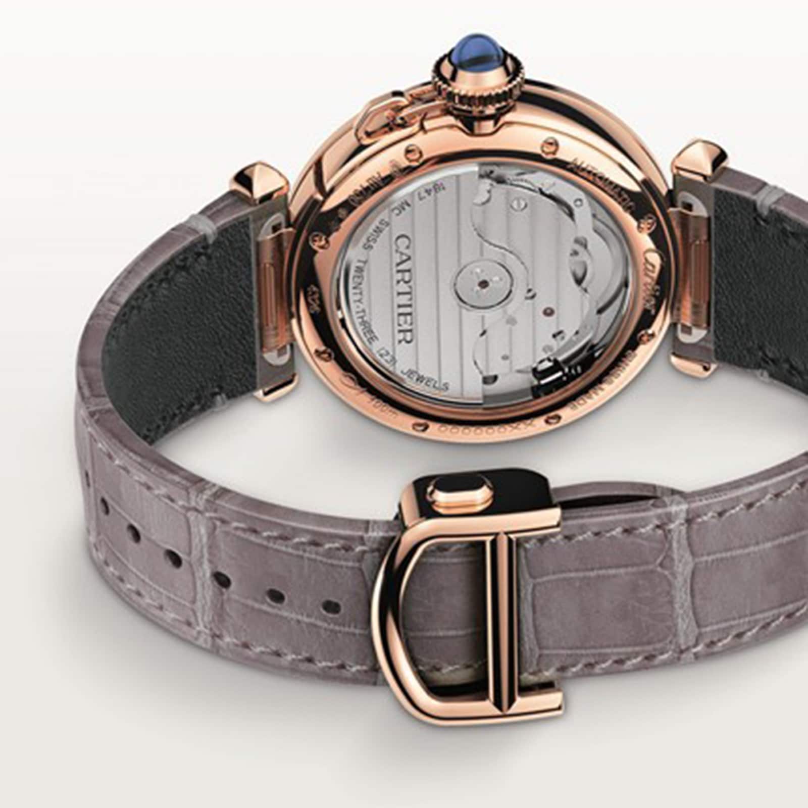 The Cartier Pasha De Cartier Watch, 35mm, showcases a blend of timeless elegance and modern functionality. It is powered by a mechanical movement with automatic winding, caliber 1847 MC, and is housed in a luxurious 18K pink gold case. The case features a fluted crown cap and crown, both set with sapphires, adding a touch of sophistication.