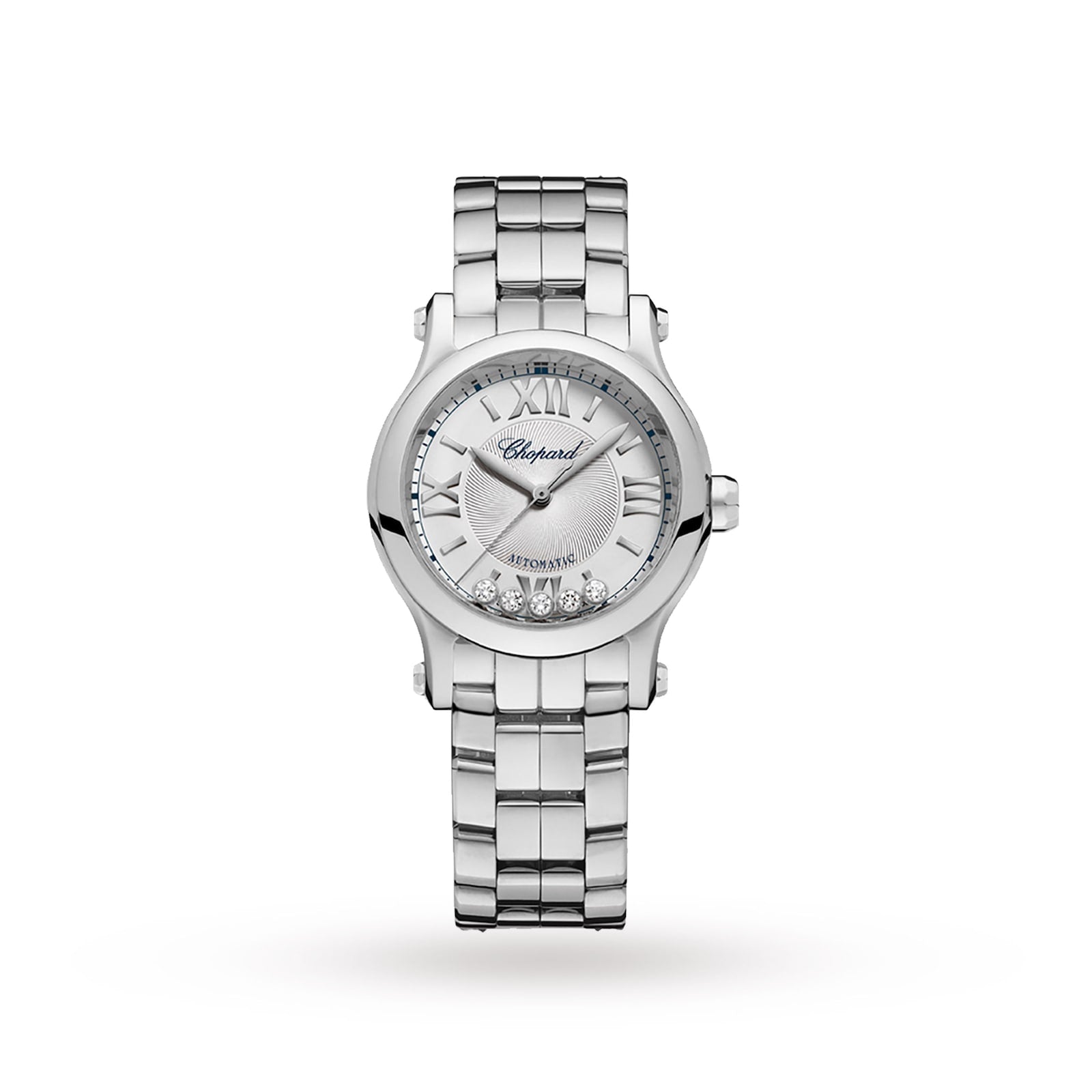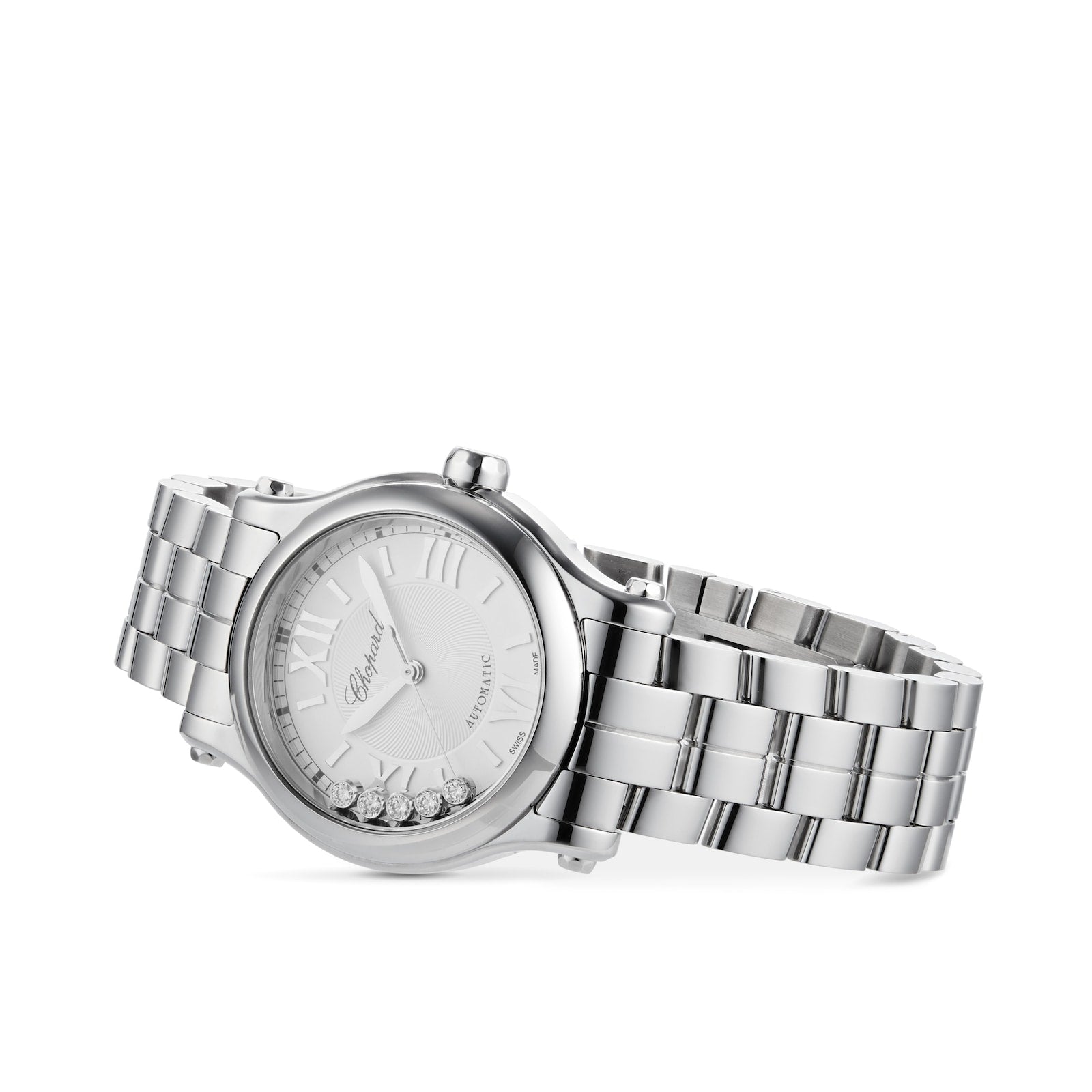 The Chopard Happy Sport Automatic Ladies' Watch, with its 30mm stainless steel case and coordinating bracelet, epitomizes timeless elegance and adaptability. Designed to complement any occasion, this watch is as stylish on the tennis court as it is at an elegant dinner.