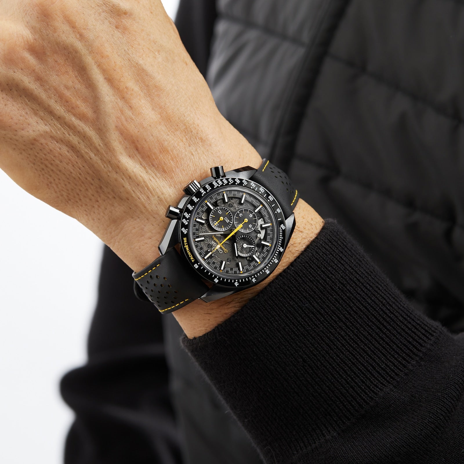 - Dial & Bezel: The black ceramic skeletonized dial mimics the cratered surface of the moon as viewed from Earth. The tachymeter scale on the bezel is filled with white Super-LumiNova for clear readability.