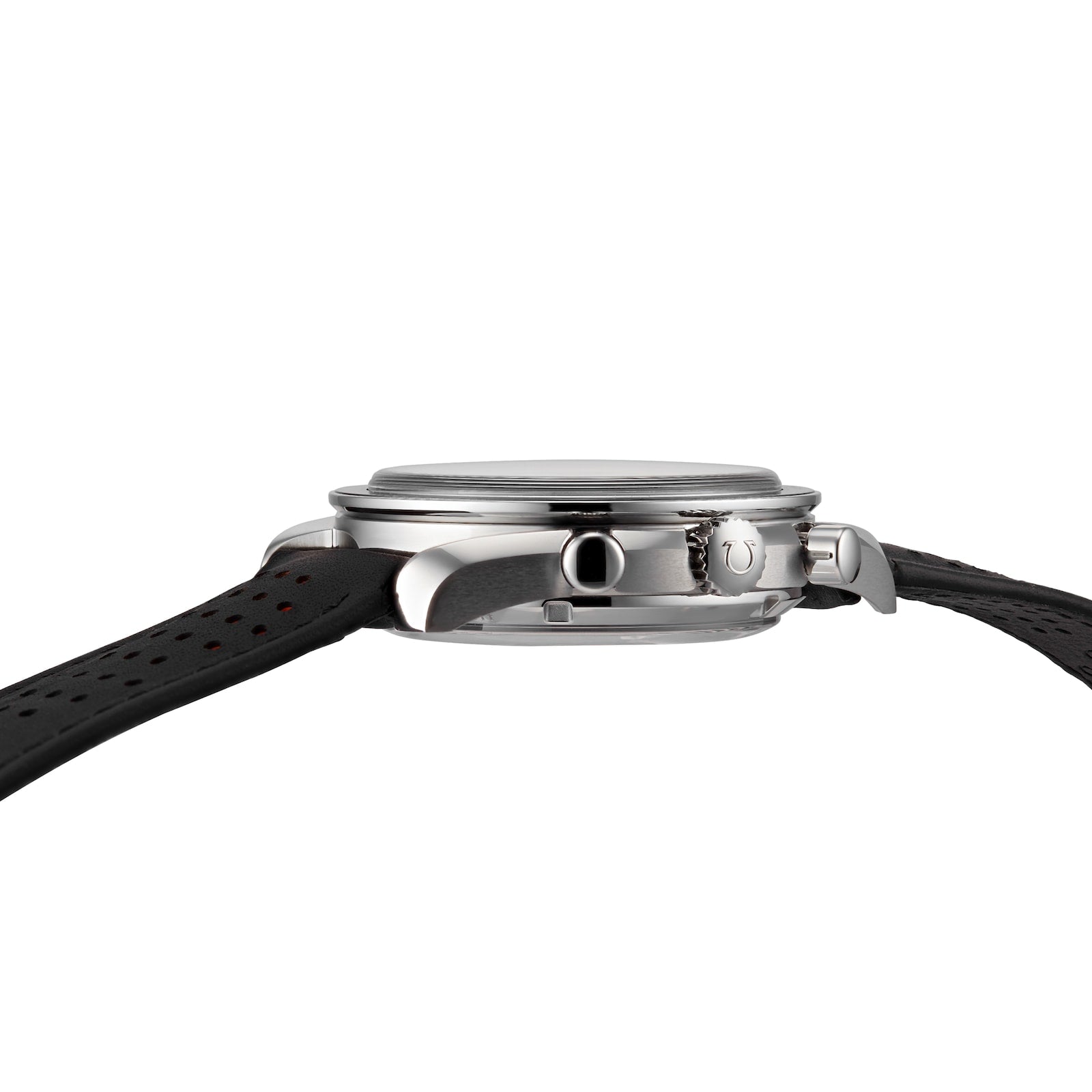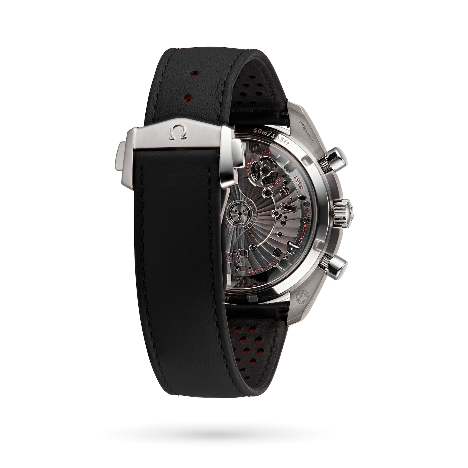 The Speedmaster Racing collection is renowned for its connection to racing, highlighted by distinctive design elements. This model features a bold racing-style minute track and vivid orange details on the black dial. The chronograph functionality is enhanced by 12-hour and 60-minute recorders, perfect for tracking elapsed time on the racetrack.